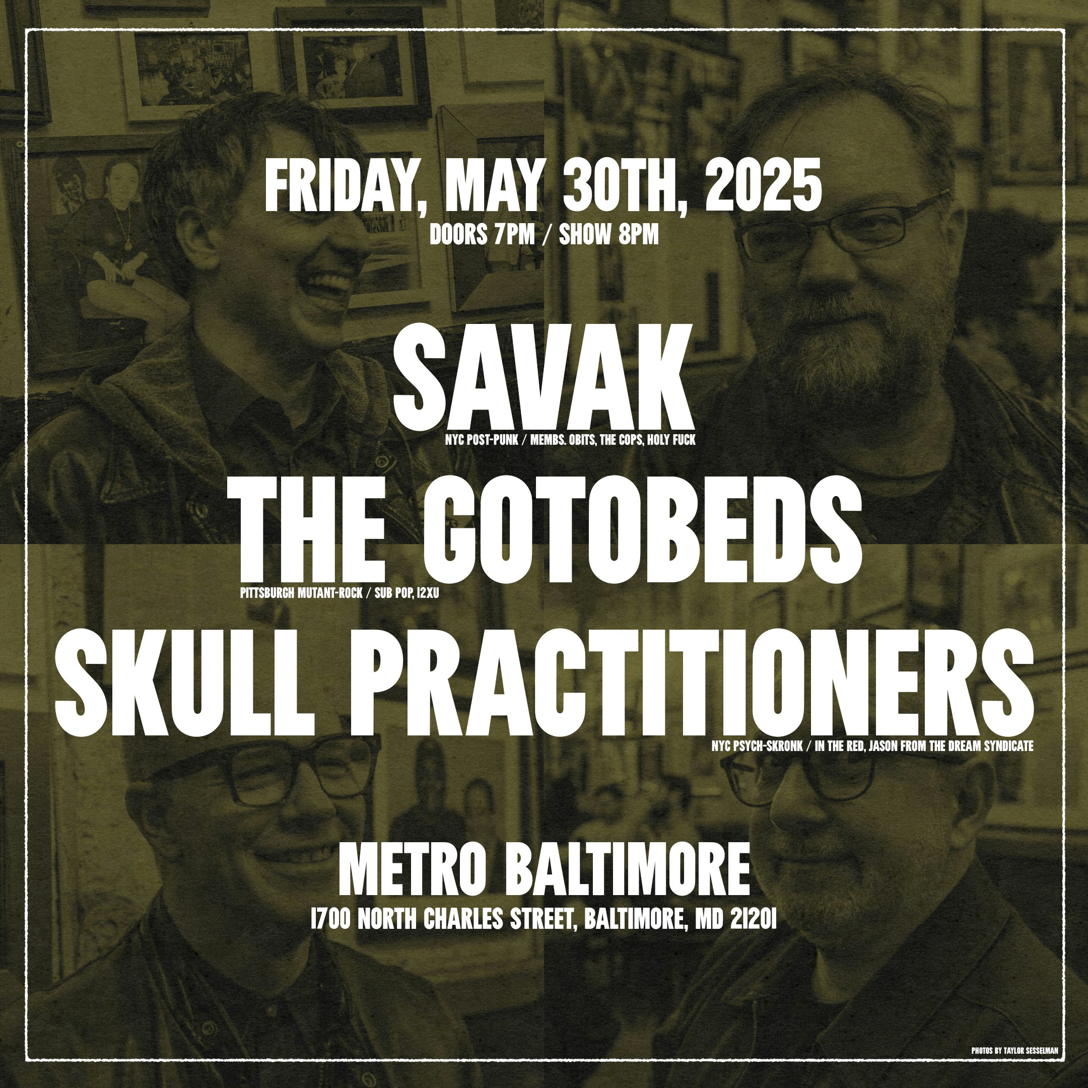 SAVAK with The Gotobeds and Skull Practitioners Friday May 30, 2025 Doors at 7:00 PM, Show at 8:00 PM All Ages Presented by Metro Gallery LLC. All ages
