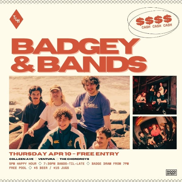 BADGEY & BANDS THURSDAY 10 APRIL FREE ENTRY – 7PM – 10PM $$$$ CASH UP FOR GRABS LIVE BANDS 7PM-10PM: COLLEEN AVE, VENTURA + THE CHORDROYS. HAPPY HOUR 5-7PM $15 COCKTAILS, $6 HOUSE BEER.