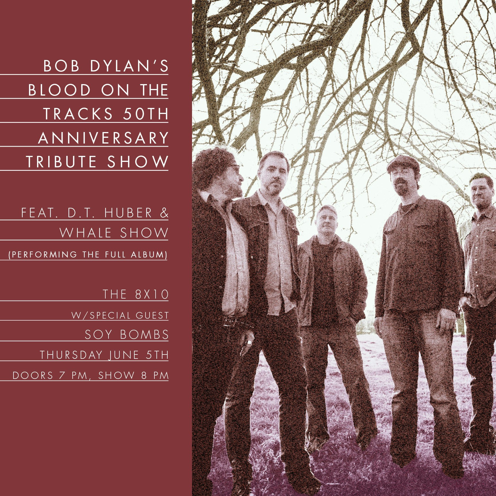 Whale Show presents Blood on the Tracks – a full-album performance of Bob Dylan’s timeless masterpiece. Known for their high-flyin’, honky-tonkin’ energy, this Baltimore-based band blends folk and Americana influences with a deep reverence for the classics. Well-versed in country and roots music, Whale Show brings their signature sound to this legendary album, delivering a heartfelt tribute to one of Dylan’s most celebrated works.