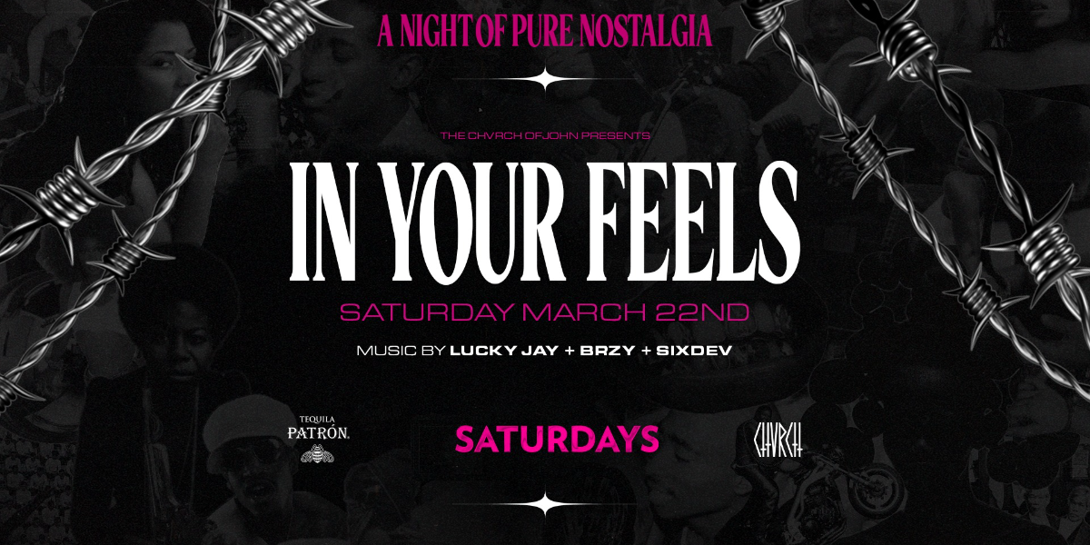 Chvrch Saturdays presents IN YOUR FEELS A NIGHT OF PURE NOSTALGIA w/ LUCKY JAY , BRZY & SIXDEV Saturday March 22 2025 at The Chvrch of John <><><><><><><><><><><><><><><><><><><><><> FREE BEFORE 11pm w/ RSVP $10 Advance/ $20+ at the Door Tickets & Bottle Service Tables available at https://thechvrchofjohn.com & https://www.showpass.com/inyourfeelsyeg <><><><><><><><><><><><><><><><><><><><><> 10260 103 ST NW . Edmonton. https://instagram.com/@thechvrchofjohn
