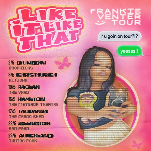 Since leaving school to pursue music full-time, Frankie has topped the Hot NZ Singles Chart, toured nationwide, supported international acts like Griff and Keenan Te, and performed alongside Coldplay at Eden Park. Her hit single How You Like Me Now hit #1 on the Official NZ Music Chart's Hot 20 Singles, cementing her as a rising star.