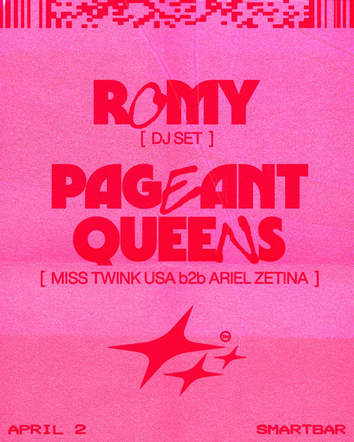 Romy (DJ Set) * Pageant Queens (Miss Twink USA b2b Ariel Zetina) 21 & Over. Valid State or Federal ID required for entry Doors open at 9:00 PM