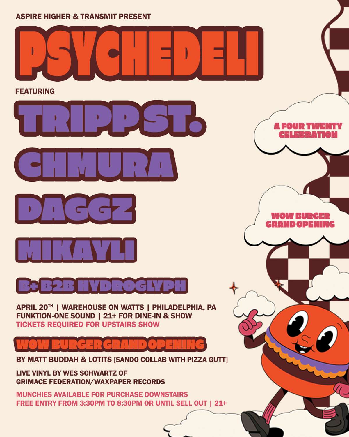 EVENT IS 21+ / ID REQUIRED FUNKTION-ONE SOUND FREE ENTRY DOWNSTAIRS - DOORS AT 3:30PM TICKETED EVENT UPSTAIRS - DOORS AT 6:00PM Tripp St. Chmura Daggz Mikayli B+ b2b Hydroglyph VENDORS www.GetLowDown.info - Aspire Higher - https://www.aspirehigher.live - Transmit - https://transmitphl.com - WoW Burger - https://www.instagram.com/wowburgerphilly/