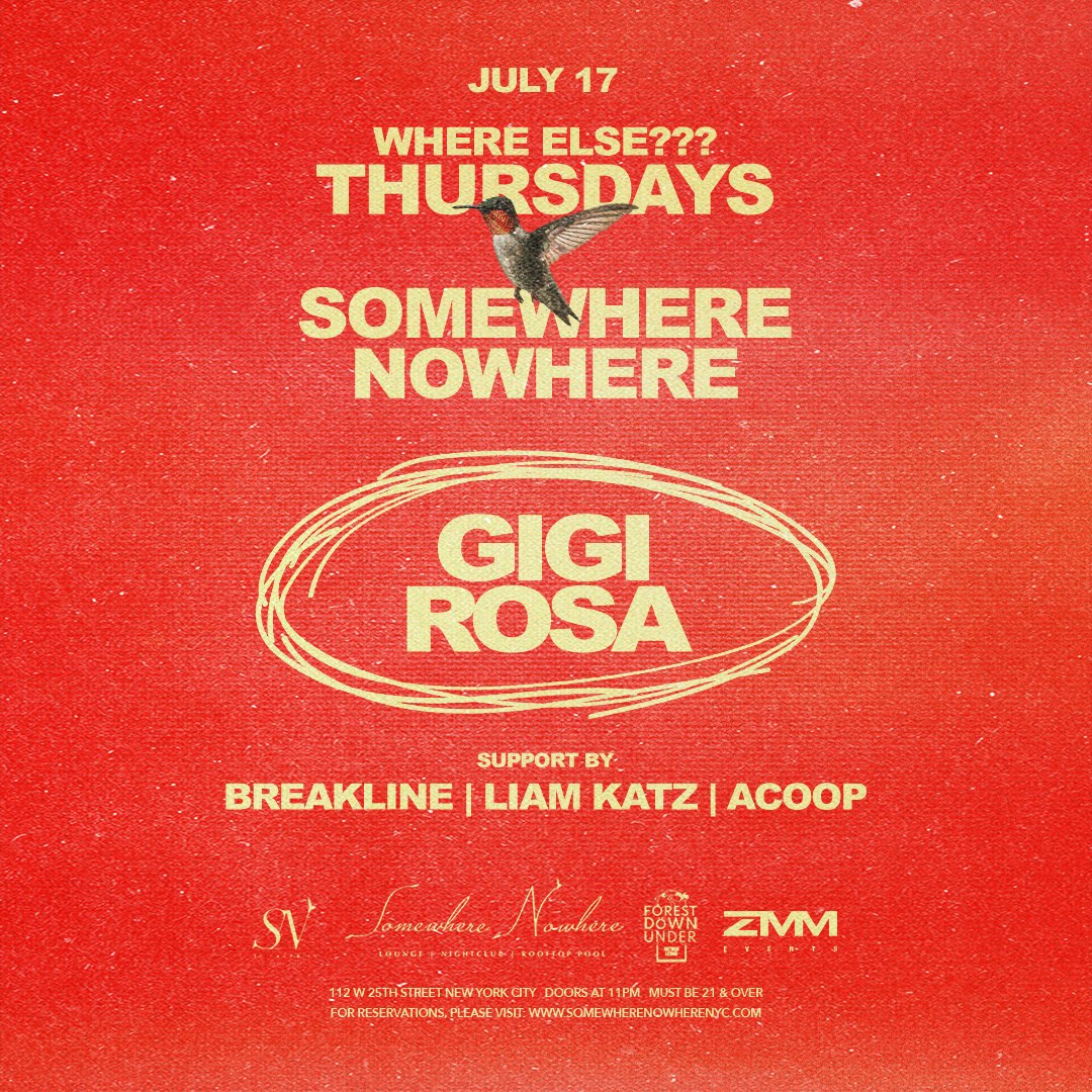 On Thursday, July 17th, Somewhere Nowhere NYC presents Where Else Thursday ft. Gigi Rosa, Breakline, Liam Katz and Acoop.
