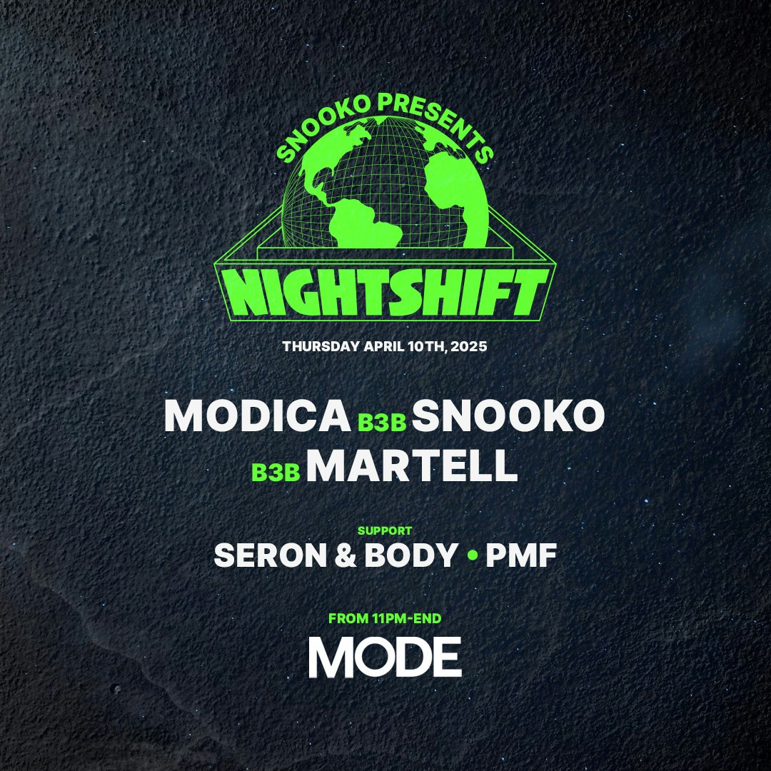 Snooko presents Nightshift at MODE featuring music by Modica, Snooko, Martel along with Seron & Body and PMF. Presented by MODE. This is a 21+ event.