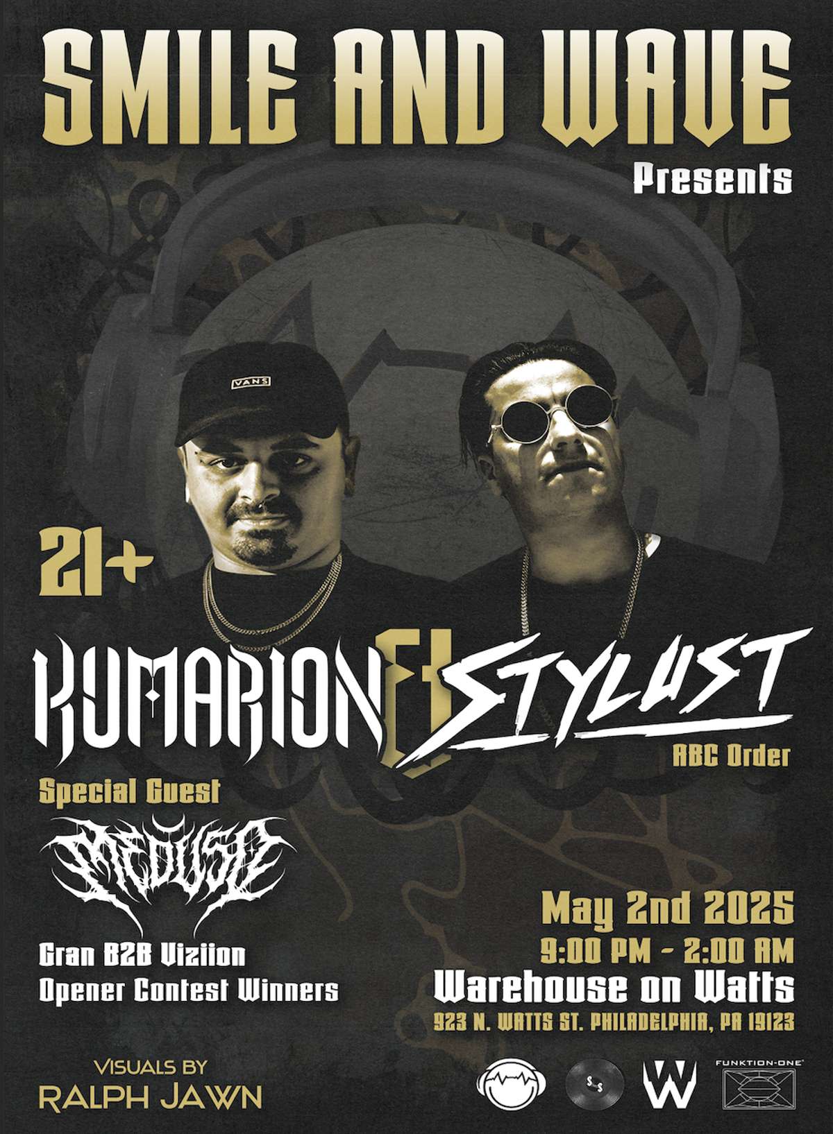Kumarion and Stylust are set to take the stage at Warehouse on Watts on Friday May 2nd! To finish the night, rising star and special guest Meduso will be making his return to Philadelphia for what is sure to be another fusion of genres and styles that will blow the roof off. Gran B2B Viziion will be bringing their fresh take on dubstep with their debut Smile and Wave set. PLUS we will be hosting an opener contest, meaning YOU could have a chance to perform at this show. The dance floor is sure to be moving to the sounds of dubstep, drum n bass, and much more! Get your tickets today!