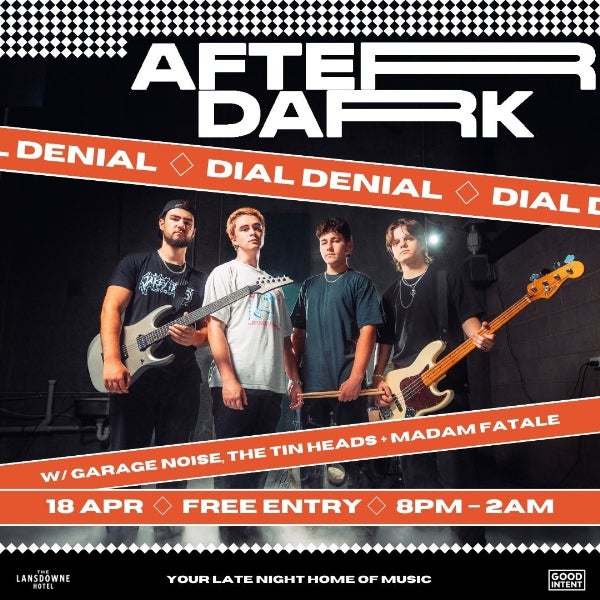 AFTER DARK 18 APRIL FREE ENTRY – 8PM – 2AM AFTER DARK W/ DIAL DENIAL, GARAGE NOISE, THE TIN HEADS + MADAM FATALE. LIVE BANDS 8PM-12AM: DJS 12AM-2AM HAPPY HOUR 5-7PM $6 HOUSE BEER, $8 SPIRITS