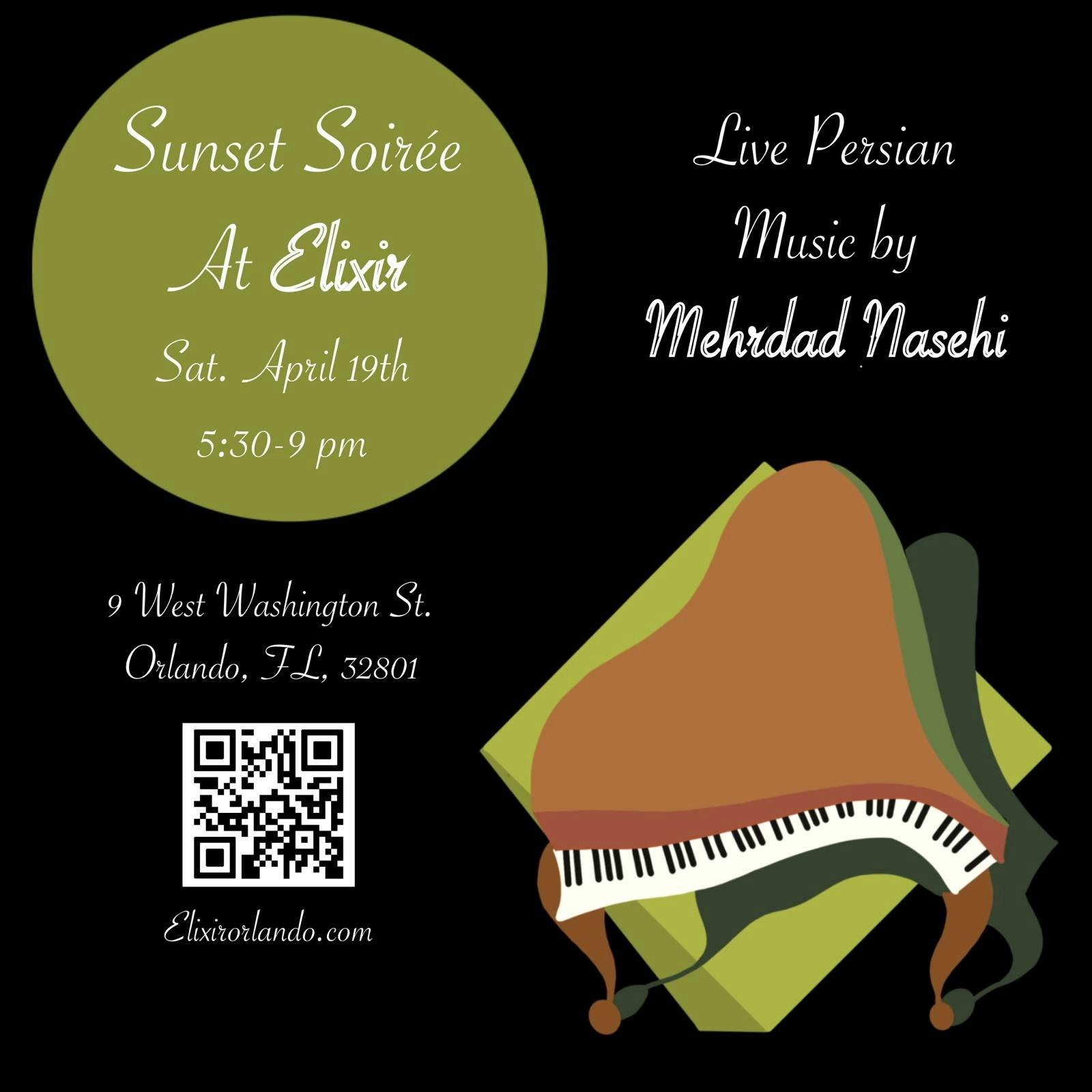 Dinner party at Elixir on Saturday April 19th from 5:30-9:00 PM with Persian Live Music by Mehrdad Nasehi. Presented by ELIXIR Orlando. This is an 21+ event