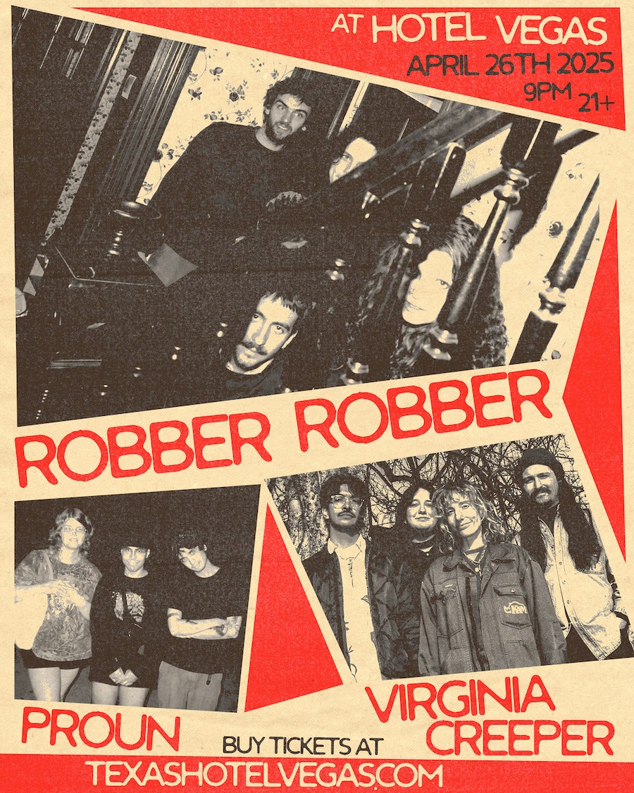Robber Robber (Burlington, Vermont) are heading to Austin and stopping by Hotel Vegas to play inside on our grandstand! Presented by Hotel Vegas. This is a 21+ event