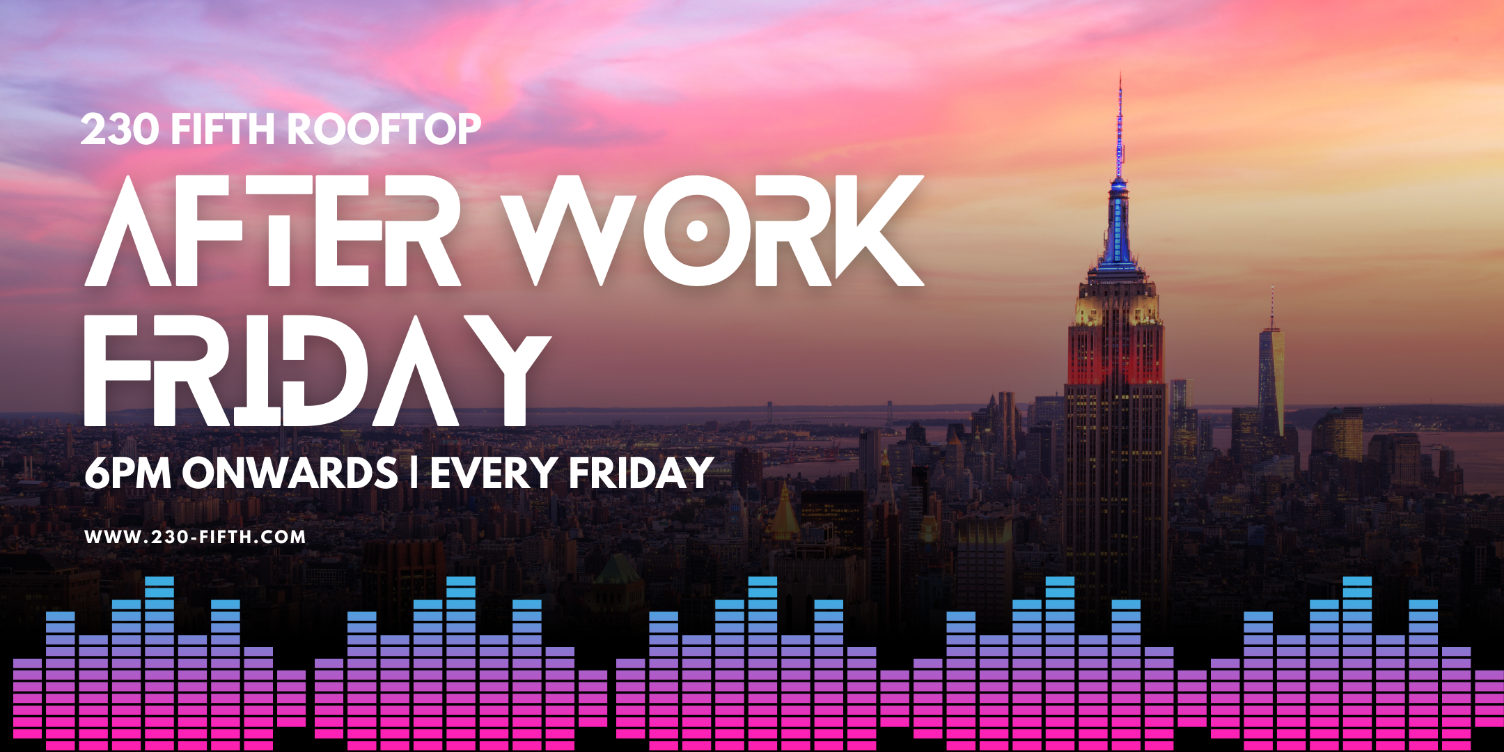 AFTER WORK ROOFTOP PARTY @ 230 Fifth Rooftopđ¸đ Join us as we watch the city turn golden with Guest DJ. Sip on signature cocktails, indulge in delicious food, and soak up the stunning skyline. Donât miss this perfect evening to unwind and enjoy the city's beauty from above!