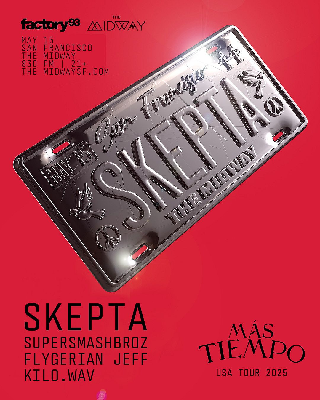 Thursday, May 15th The Midway presents: Skepta Más Tiempo DJ set RiDE Featuring: Skepta SuperSmashBroz Flygerian Jeff KILO.wav 21+ Event, Doors @ 8:30 PM 900 Marin St., San Francisco