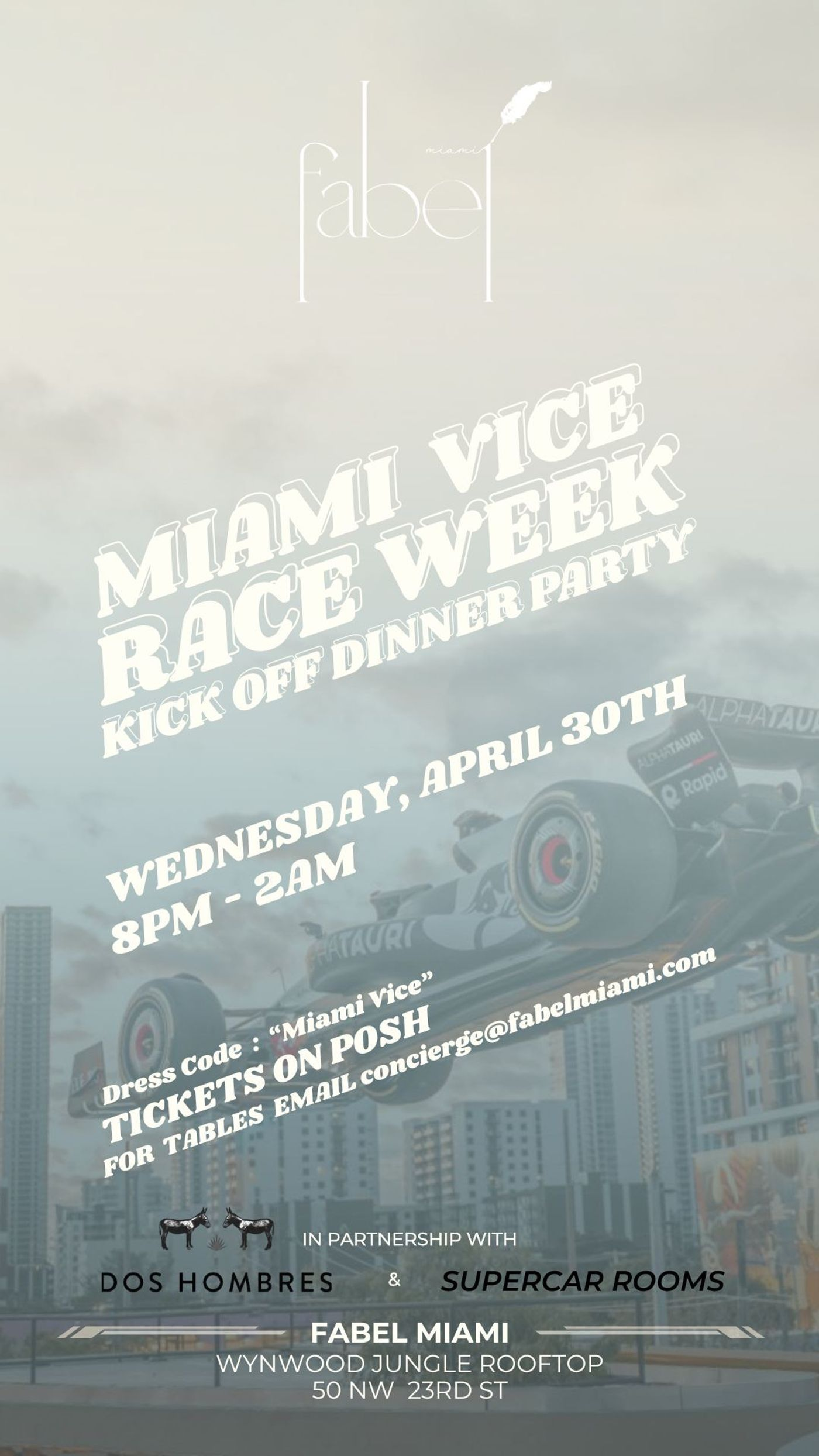 Fabel Miami Vice Race Week Kick Off Party! MIAMI VICE STYLE! Join us and our friends at Dos Hombres & Supercar Rooms for our annualRace Week Kick Off party with some of the biggest celebrities on the circuit! Entertainment all night with plenty of food and flowing cocktails all night! Make sure to reserve your table in advance. We will hit capacity!