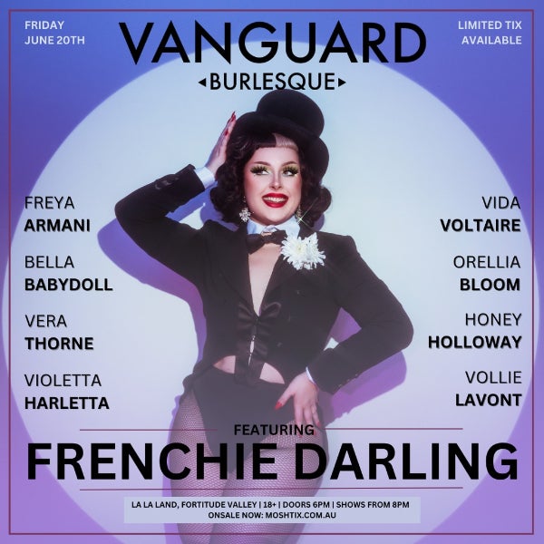 It’s our 12th birthday and we’re celebrating with reigning Mx Burlesque QLD, Frenchie Darling! Don't miss an incredible lineup additionally featuring Freya Armani, Bella Babydoll, Vera Thorne, Violetta Harletta, Vida Voltaire, Honey Holloway, Orellia Bloom, and special guest MC Vollie LaVont! With previous shows selling out, book early to avoid disappointment!