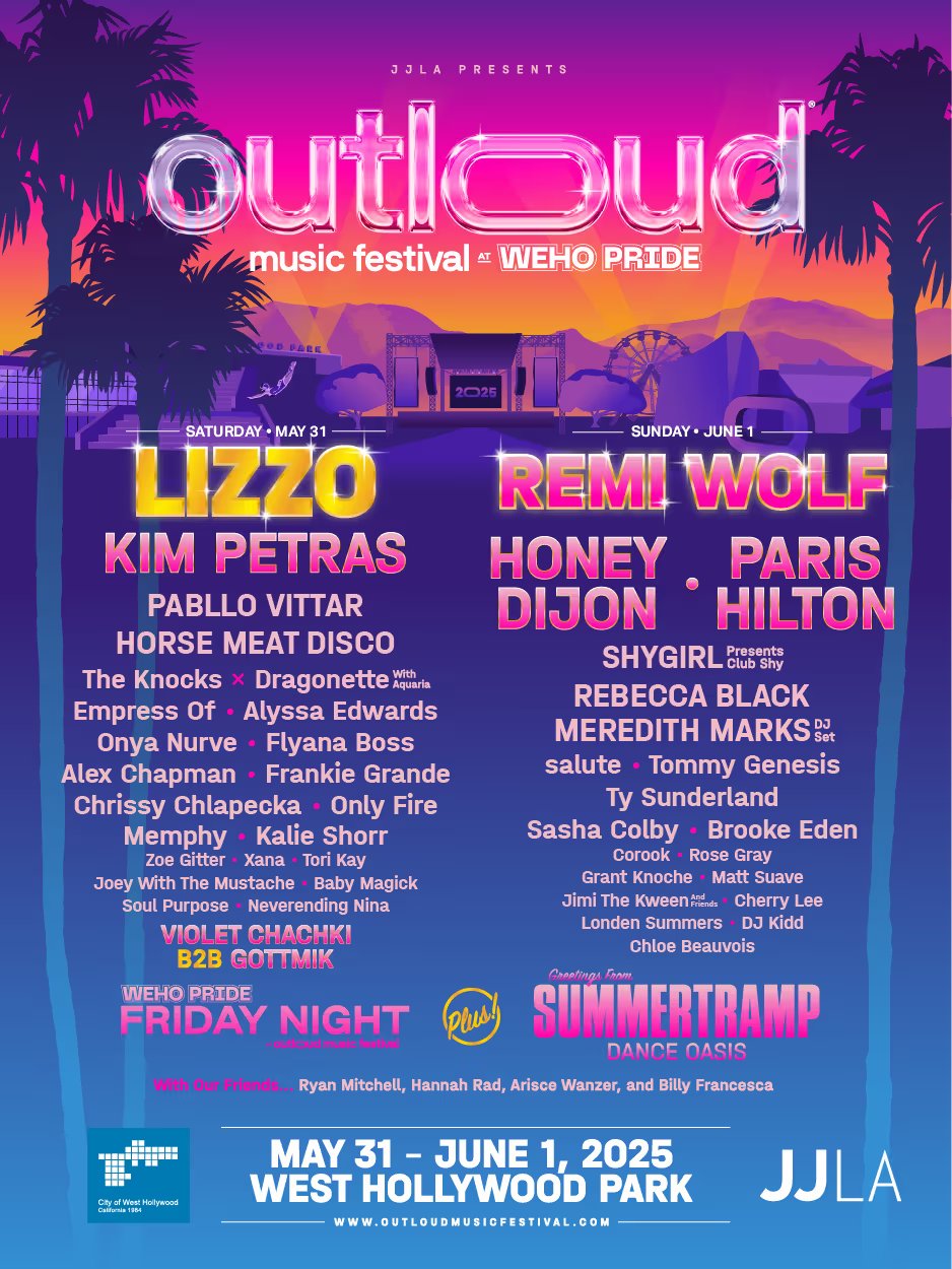 OUTLOUD Music Festival at WeHo Pride is a multi-day, award-winning LGBTQ+ Music Festival , happening May 31 & June 1 with a star-studded, high-energy line-up celebrating and advocating for queer voices! This high-energy concert features show-stopping performances from the OUTLOUD Main Stage. Guests can enjoy tasty food and beverage areas, craft cocktails and beer gardens, photo ops, surprise appearances, and world-class stage production.