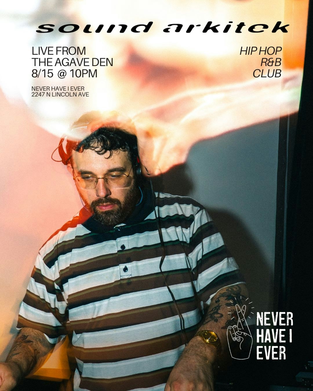 Sound Arkitek is a Chicago-based DJ with residencies at Blind Barber and The Revel Room who plays venues all over the city while maintaining a monthly drum & bass show on London radio station Subtle. His party "Taste." is the hottest open-format night in the city where he seamlessly blends hip-hop, R&B, club music, and the unexpected into an experience unlike any other. His other party, "CLUB S\*\*T," is a night where you can expect to hear house, footwork, jungle, drum & bass, grime and more - a celebration of club and sound system culture. As a producer, he has self-released drum & bass tunes, boom-bap hip-hop beats, and his monthly Patreon with his own edits is ever growing. Quickly becoming one of the most sought after DJs in Chicago - he brings his signature open format stylings to the Never Have I Ever Agave Den where you can expect to hear everything you love, new favorites, and exclusive edits of his own. You don't want to miss this set.