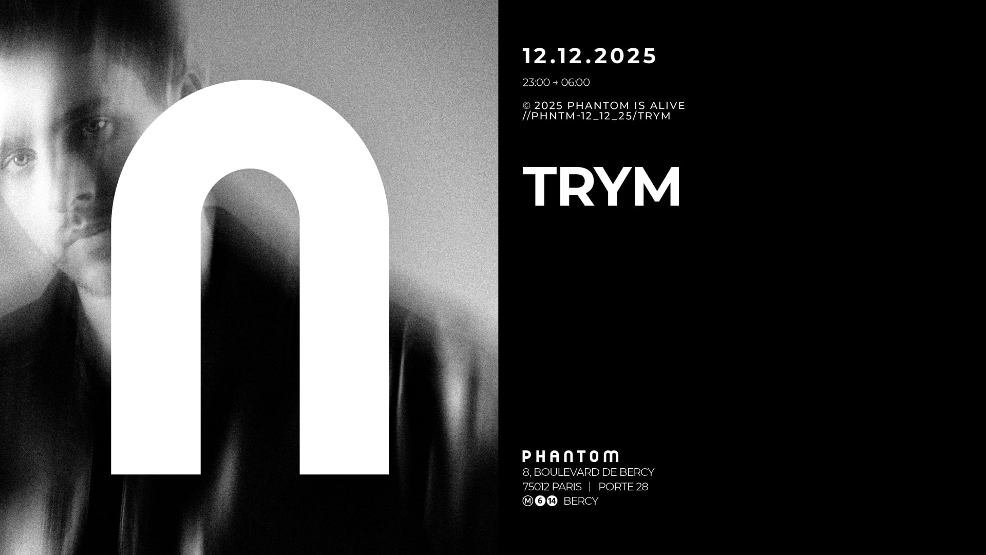 ▼ Phantom : TRYM ▲ 23:00 → 06:00 Le phénomène français Trym revient au Phantom avec son énergie implacable. Entre techno puissante et mélodies épiques, il transforme chaque date en expérience collective où le dancefloor devient un terrain de liberté totale. French phenomenon Trym returns to Phantom with his relentless energy. Blending powerful techno and epic melodies, he turns every date into a collective experience where the dancefloor becomes a space of total freedom. ► INFOS PRATIQUES Vestiaire sur Place Vaste fumoir ► L’accès à Phantom est réservé aux personnes majeures et strictement interdit aux mineurs. Veuillez vous assurer d'avoir en votre possession une pièce d'identité avec photo valide en format physique pour accéder à l'événement. Veuillez noter que seuls les passeports valides, les cartes d'identité nationales étrangères et les permis de conduire sont acceptés comme preuve d'identité et/ou d'âge. ► ACCÈS PLACE LEONARD BERNSTEIN, PARIS 12 Métro : 6 / 14 Bercy : Sortie 6 - rue de Bercy Bus : 57 / 63 / 71 / 72 / 91 Dépose minute : 85, rue de Bercy ► SUIVEZ-NOUS