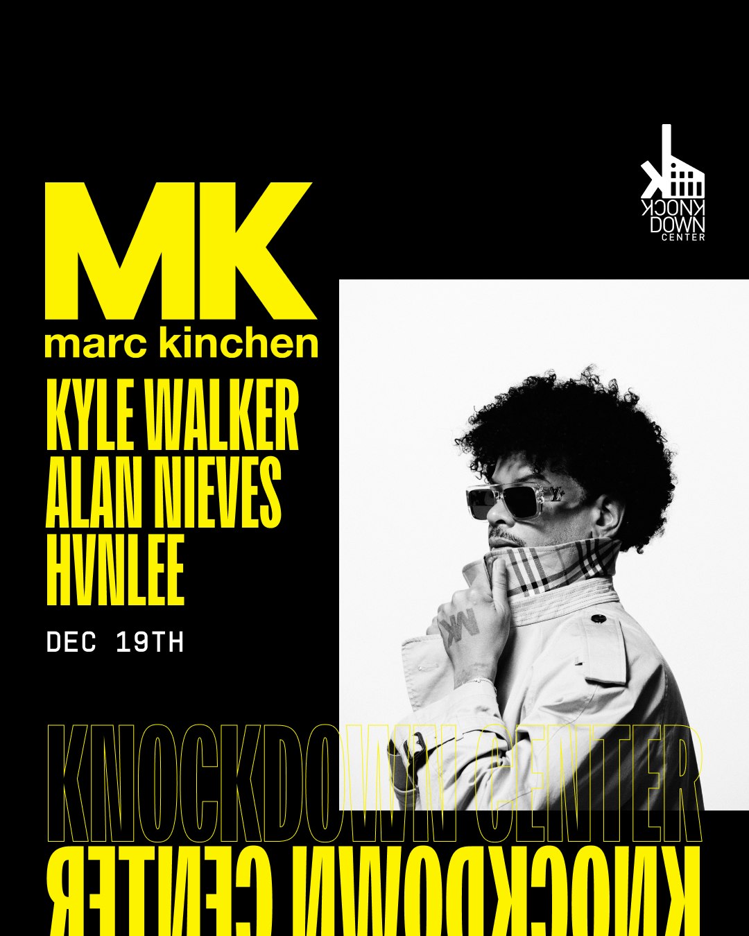 House music luminary MK returns to Knockdown Center to headline the Main Hall. One of the greatest and most influential producers in the history of the genre, MK's works are seminal entries in the canon and essential listening for house heads. He is joined by LA breakout Kyle Walker, an artist whose deep, sultry tracks have made him a household name in only a few short years. NY's own Alan Nieves steps back in the building after his appearance alongside Hot Since 82. Philadelphia's HVNLEE makes her debut.