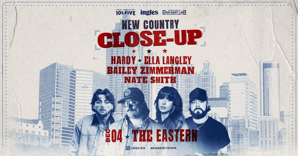 Get ready for the ultimate close-up with New Country 101-FIVE! Join us for a New Country Close-Up featuring Bailey Zimmerman, HARDY, Ella Langley, and Nate Smith — all sharing the stage for one unforgettable night at The Eastern on Thursday, December 4th. Brought to you by Ingles, Van Sant Law, Lincoln Tech, and Beaver Toyota, this once-in-a-lifetime event will feature your favorite country stars performing their biggest hits and sharing the stories behind the music."