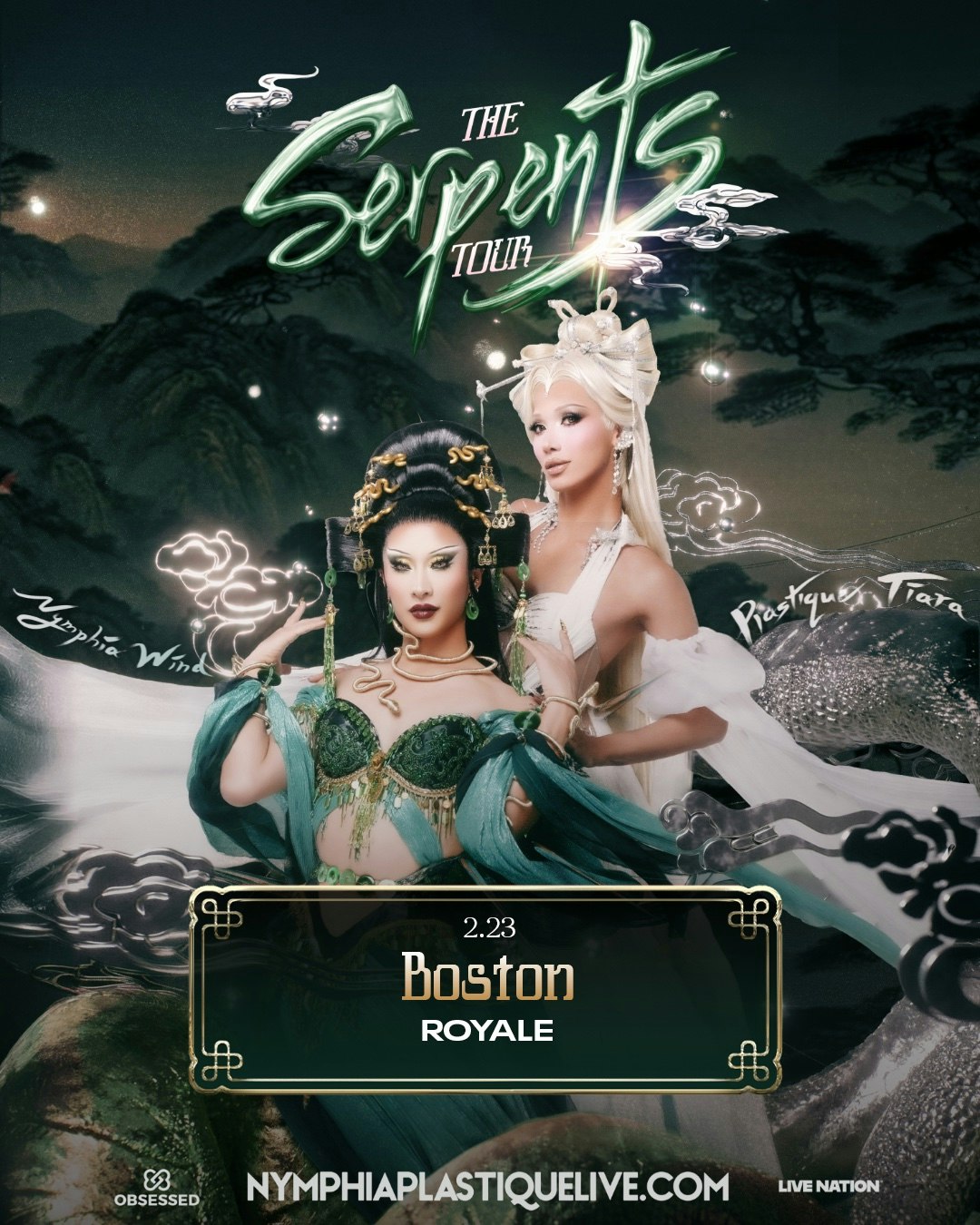 The Serpent Sisters Tour unites Nymphia Wind and Plastique Tiara, two of the world’s most celebrated Asian drag artists, for an unforgettable live experience across North America. Inspired by the legendary folktale of the White Snake and Green Snake, the show follows two mystical serpents on a journey of love, adversity, and sisterhood. Audiences can expect couture costumes and dynamic performances that celebrate cultural heritage, pop culture, and drag artistry. Each city will feature local AAPI and LGBTQIA+ talent, giving them a stage to shine and amplifying their voices.