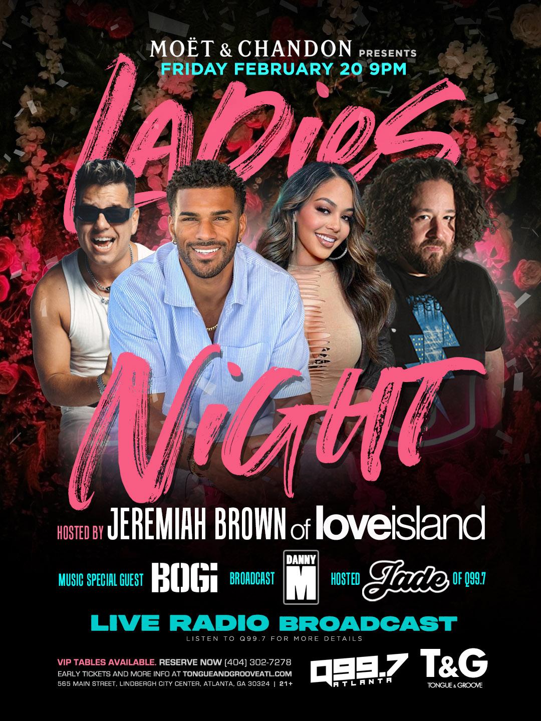 Friday NightTongue and Groove and Q99.7 Ladies Night w/ Host Jeremiah of LOVE ISLAND + BOGI +DannyM & Jade of Q99.7 Atlanta!