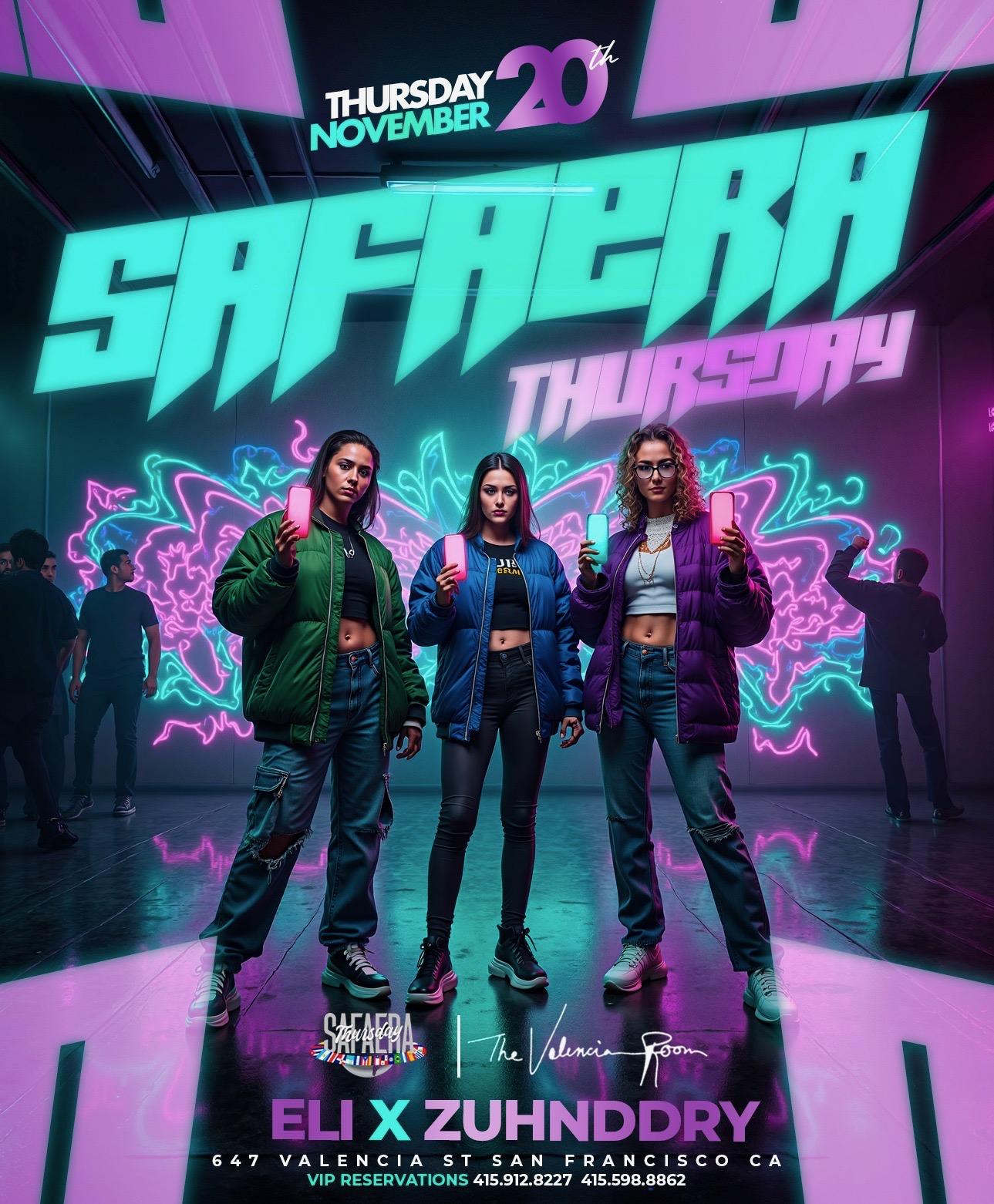 Safaera Thursdays - Top Bay Area DJ’s comin in HOT. It’s a Party It’s a Party….🔊 Regggaeton & Hip Hop: @ELIDJELI + @ZUHNDDRY
