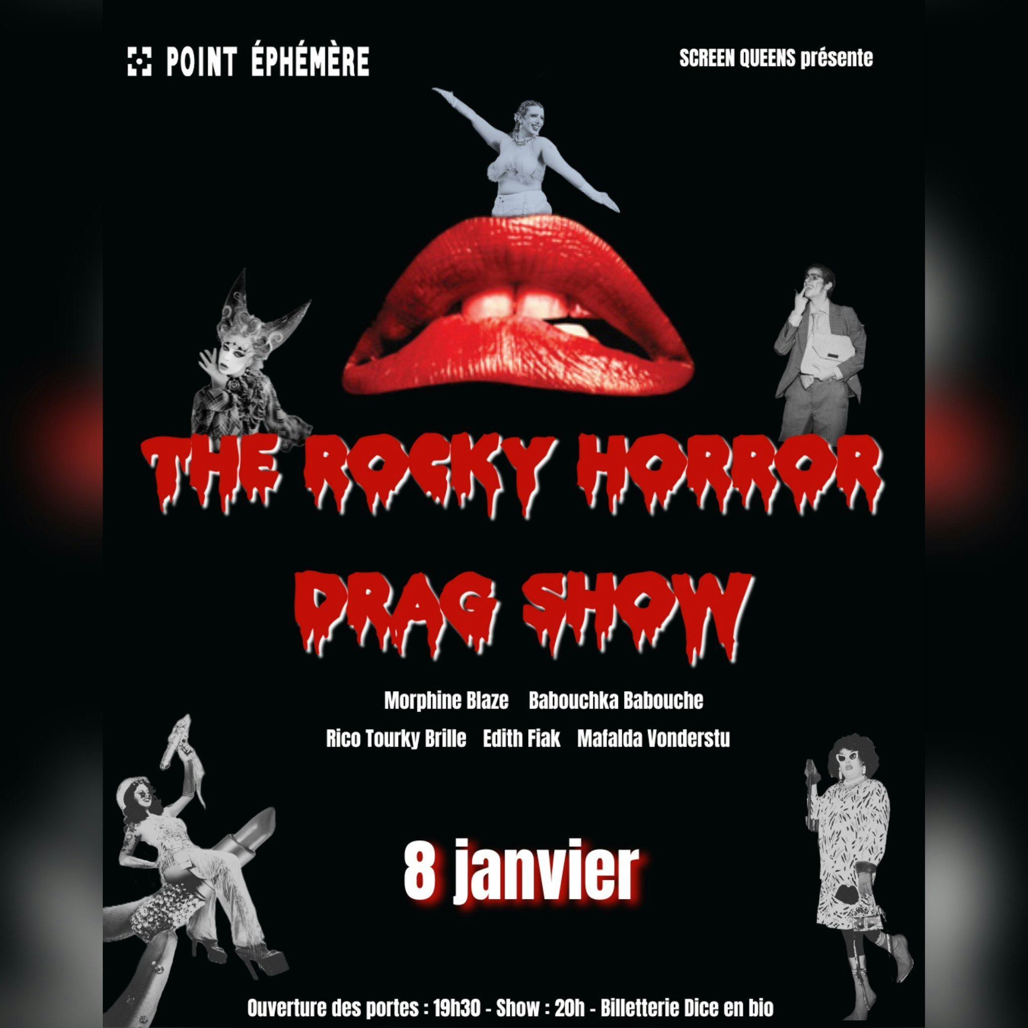🦇 Screen Queens : THE ROCKY HORROR DRAG SHOW ! 🦇 Let’s do the Time Warp Again !⚡ Venez assister à la version drag du mythique Rocky Horror Picture Show ! Avec Babouchka Babouche, Morphine Blaze, Edith Fiak, Rico Tourky Brille & Mafalda Vonderstu N'hésitez pas à venir costumé.es, le Time Warp sera participatif !!! Ouverture des portes : 19h30 Show : 20h Présenté par POINT EPHEMERE. -