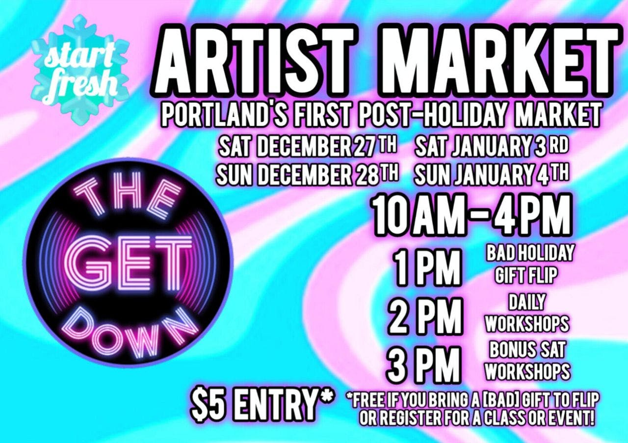 We are launching the Artist Market at Start Fresh Festival this year. We are featuring a variety of vendors selling a variety of gift-able products, many made right here in Portland. I tried to focus on finding small vendors, so this isn't your typical market, in fact, this may be the only market designed for AFTER the holidays, you know, in case you're still searching for that perfect gift for you or someone you like. maybe you're trying to re-do the gift you got for someone you love? Either way, you might find something you like at this market! We also host daily workshops, two on Saturdays, and a bad holiday gift flip for even more opportunities to find the perfect gift for yourself or someone else. The Get Down will have drinks for purchase so this event will be 21+