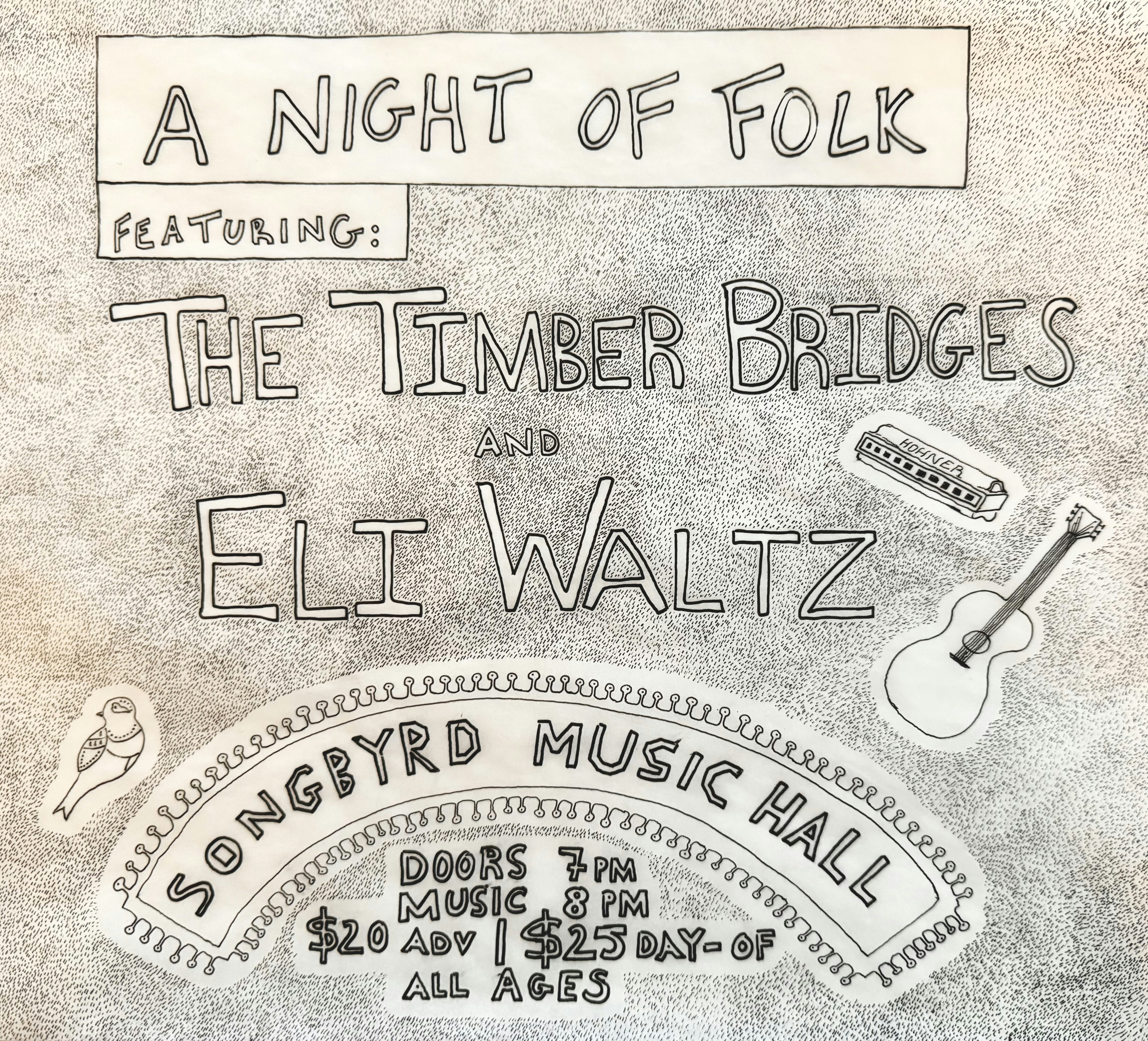 Come spend an unplugged evening with folk troubadours The Timber Bridges and Eli Waltz - a night of fingerpicked guitar, fiddle, harmonica, and warm Americana vibes. The Timber Bridges, a DC-based folk trio, bring close harmonies and acoustic arrangements rooted in the city’s folk tradition. Folk songwriter Eli Waltz returns for a special hometown return show, bringing intimate storytelling and a heartfelt connection to the city that shaped his early years as an artist.