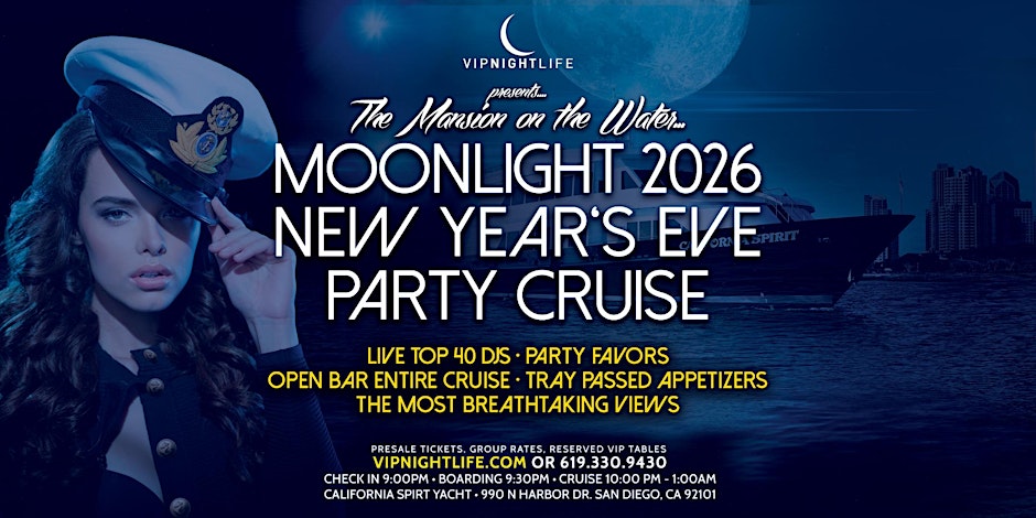 California Spirit Yacht 990 N. Harbor Drive, Gate #1 San Diego, CA 92101 United States The only way to catch the true spirit of San Diego is to embark on this Moonlight New Year’s Eve Party Cruise 2026 on the California Spirit!