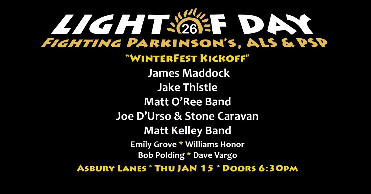 The Light of Day Foundation, a registered NJ 501 c3 charity foundation, utilizes the awesome power of music to raise money and awareness in its quest to end Parkinson’s disease and its related illnesses ALS (Amyotrophic Lateral Sclerosis) and PSP (Progressive Supranuclear Palsy) within our lifetime. We award grants to fund research and education, to create and improve therapies and to provide support for those who suffer from these diseases and their caregivers. For more LOD WinterFest information go to our website LightofDay.Org, Facebook, Instagram and the LOD App during the week of the shows... *Artists, times and venues are subject to change. The Light of Day App will have the most up to date information during the festival. Main Stage Bands: James Maddock Band Jake Thistle Band Matt O’Ree Band Joe D’Urso & Stone Caravan Matt Kelley Band Acoustic Stage Artists: Williams Honor Emily Grove Bob Polding Dave Vargo