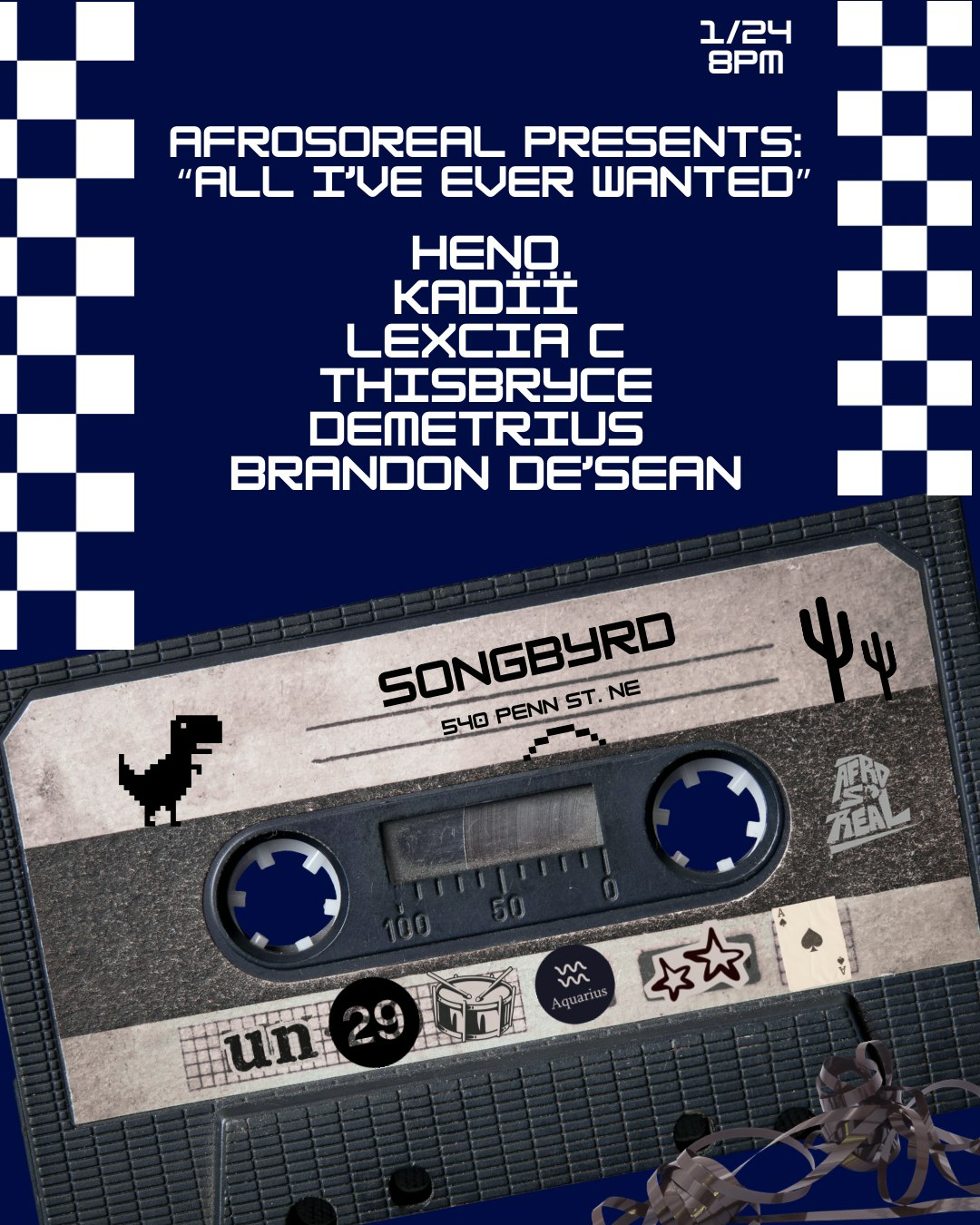 AfroSoReal’s back at Songbyrd on January 24th at 8 pm! Not only are we celebrating our founder's Uche's bday but we are so excited to announce our headlining artist, Heno. and fellow performing stars, Kadïï, Lexcia C, Thisbryce, Demetrius, and Brandon De'Sean for the show "All I've Ever Wanted"!! See you at the Songbyrd!