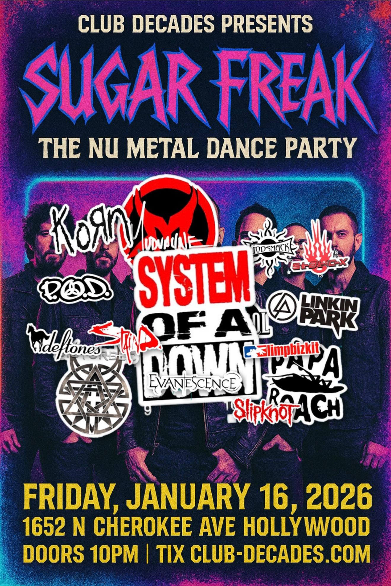 Get ready to bang your head all night at Sugar Freak - Nu Metal Night, where heavy beats and wild vibes collide!