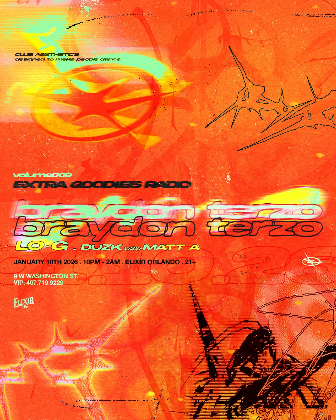Extra Goodies and Elixir present Extra Goodies Radio Volume 009 with BRAYDON TERZO \[Nervous\], LO-G & DUZK + MATT A on Saturday, January 10th. Doors: 10 PM VIP: [813.541.1613](tel:813.541.1613) Presented by ELIXIR Orlando. This is an 21+ event