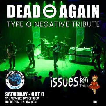 Dead ⊖ Again is back at Buffalo Iron Works on Saturday, October 3rd, bringing a full night of dark, heavy, and haunting Type O Negative vibes — joined by Issues, a crushing tribute to Korn.