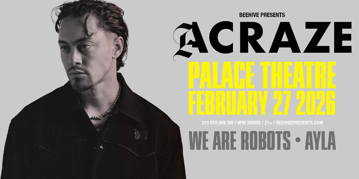 Beehive Presents: A C R A Z E (Thrive Records / USA)Plus special guests TBA (( A 360° EXPERIENCE AT THE PALACE THEATRE )) FRIDAY FEBRUARY 27 2026THE PALACE THEATRE - 219 8TH AVE SWADDED PRODUCTION + LIGHTS / DECOR + PK SOUND Tickets on sale FRIDAY DEC 12 at 10AM MST: showpass.com/acraze2026 Book your bottle service group in with us, space is limited.