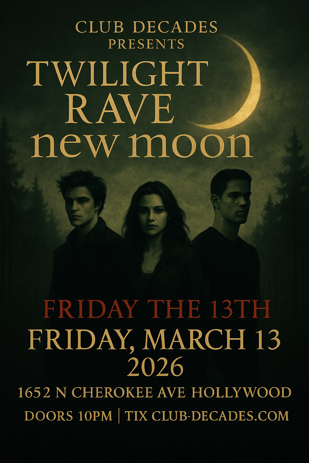 Step into the shadows and relive the magic, mystery, and eternal romance of the Twilight saga with a night of anthems, nostalgia, and darkness as we transform the dancefloor into a vampiric fantasy.