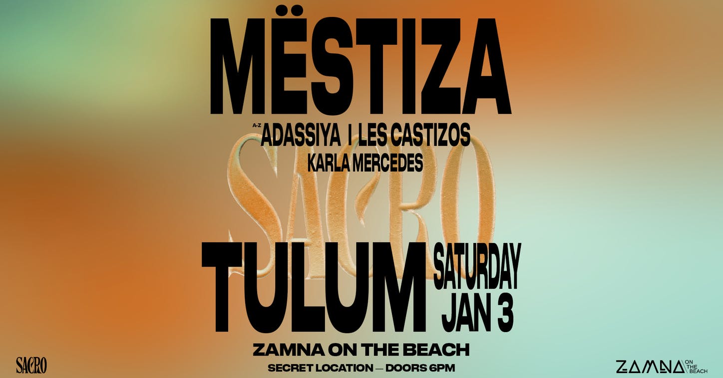 On January 3, 2026, Zamna on the Beach hosts SACRO, the signature party by MËSTIZA, bringing their unique fusion of electronic music, flamenco culture and powerful feminine energy to the shores of Tulum. Set against the natural beauty of the Caribbean, this special afternoon-to-night experience promises a deep and immersive musical journey.