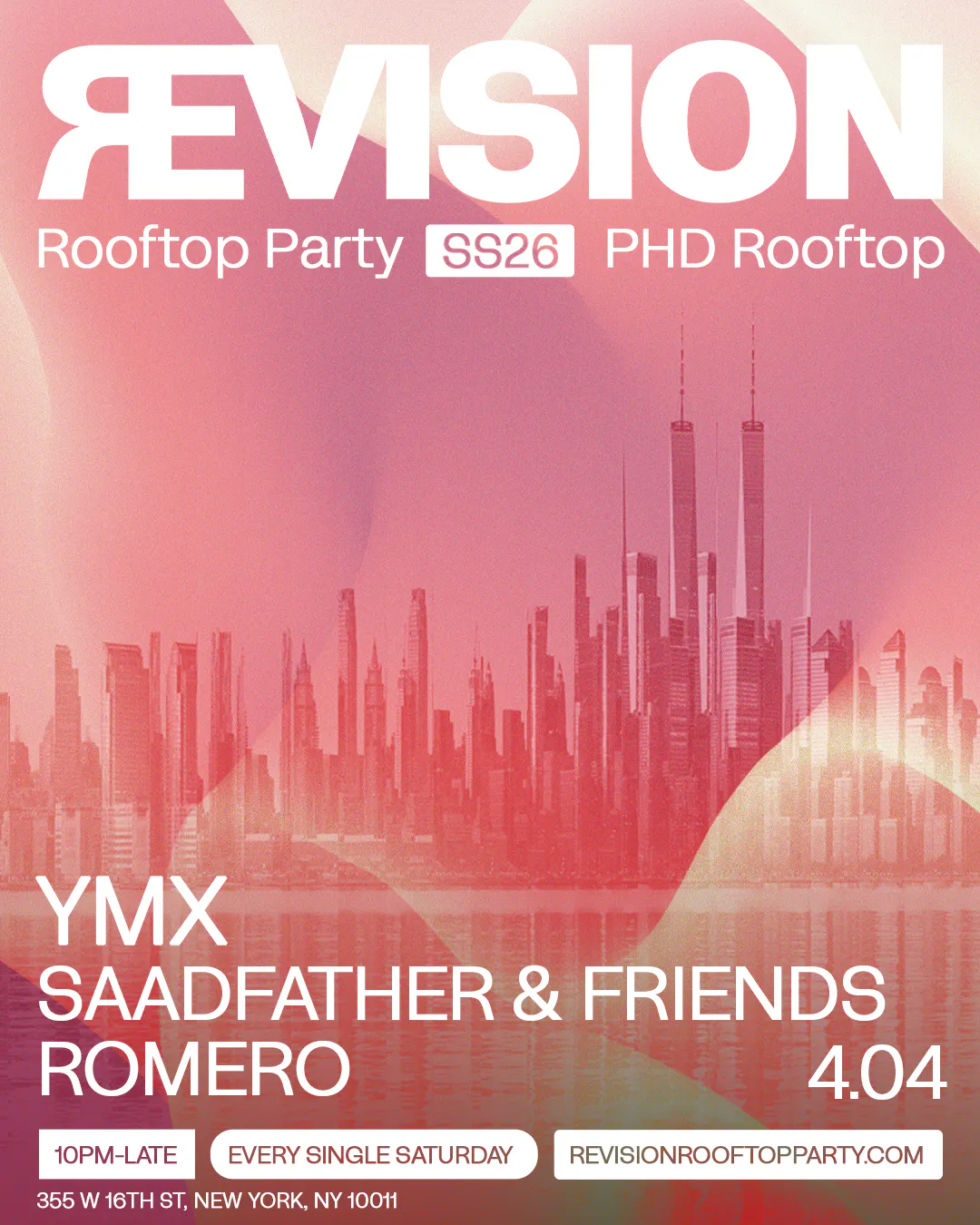 What is Revision Rooftop Party?\ Revision is a high-energy rooftop nightclub experience every Saturday night at PHD Rooftop. Expect a packed dance floor, concert-style production, and DJs spinning house, EDM, Top 40 remixes, and throwbacks — all set against sweeping NYC skyline views.