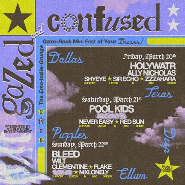 The first edition of Gazed and Confused Festival is coming to Dallas at Puzzles Deep Ellum on March 20-22 2026, featuring Holywatr, Pool Kids, and Bleed.