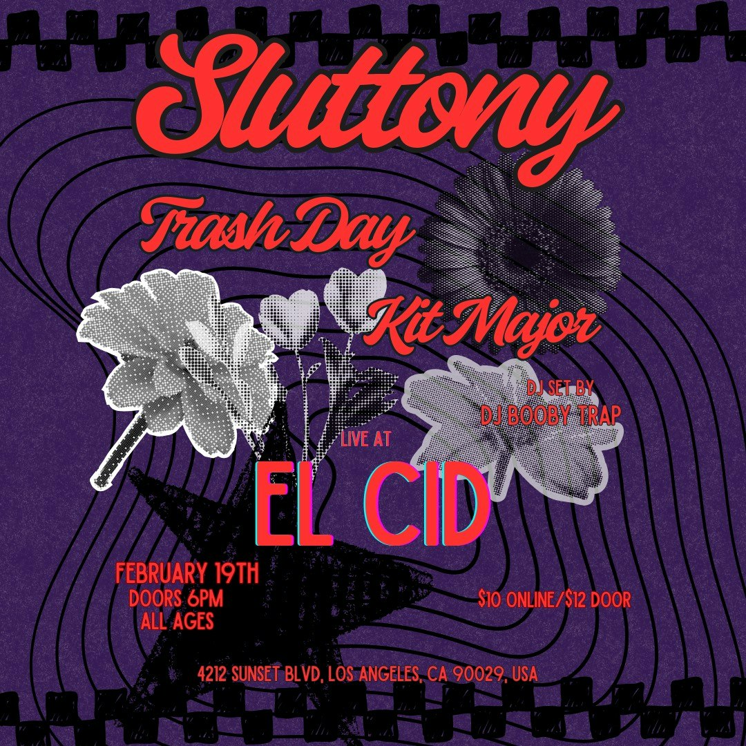 Sluttony, Trash Day, & Kit Major live at El Cid with a dj set by DJ Booby Trap Presented by El Cid. This is an AA event