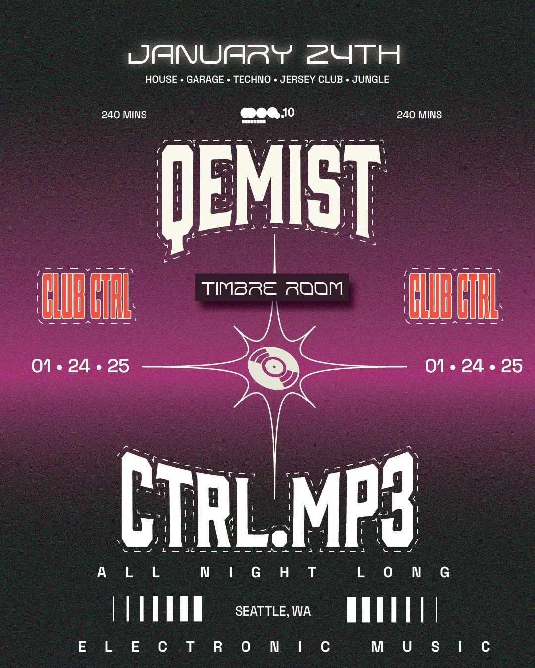 Club CTRL from House, Garage, Techno, to Jungle. An all-night experience from CTRL.MP3 and special guest, Qemist, bringing a huge range of styles and genres.
