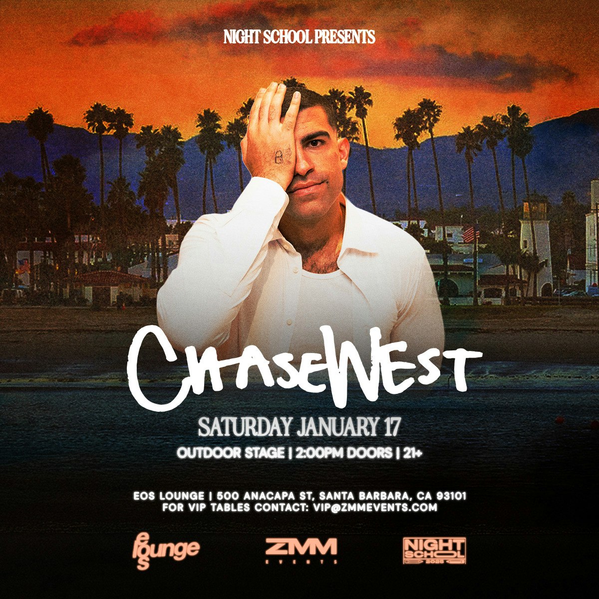EOS Lounge x ZMM Events present an outdoor daytime party featuring ChaseWest. Direct Support: Aiden Roth b2b Isaac Lane Support: I4m, Henry Cheatham, Jackson Rubic After Party: TBA Presented by EOS Lounge & ZMM Events. This is an 21+ event