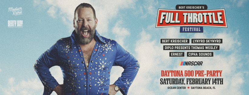 Famed comedian, actor and podcaster Bert Kreischer is going Full Throttle with NASCAR, unveiling the inaugural Full Throttle Festival as the Official Daytona 500 Pre-Party. All personally curated by Bert prepare for Music, Comedy, BBQ, and Beer Headlined by Lynyrd Skynyrd, Diplo Presents Thomas Wesley, ERNEST And Bert Kreischer! This one-of-a-kind festival is set to become Daytona 500’s biggest event ever, where the energy of NASCAR meets the thrill of live comedy and music on the eve of the race.