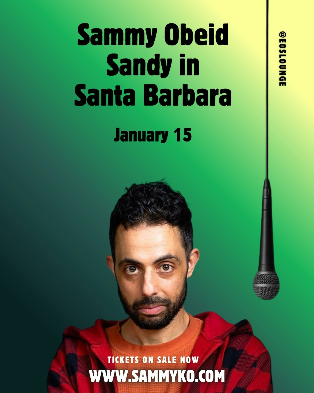 Comedian Sammy Obeid (Netflix, Conan) performs Sandy in Santa Barbara! LIVE! ONE NIGHT ONLY! Thursday, January 15, 7:00pm at EOS Lounge.