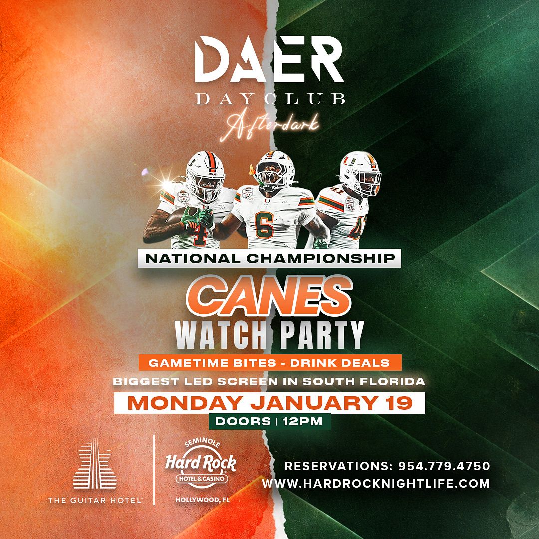 Canes Watch Party at DAER Dayclub in the Guitar Hotel! The Largest LED Screen in South Florida! Tickets valid for anytime entry.