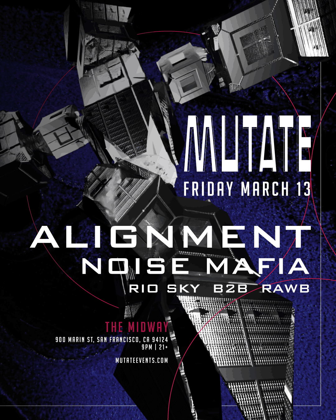 Friday, March 13th The Midway and Insomniac present MUTATE SERIES ALIGNMENT NOISE MAFIA RIO SKY b2b RAWB (Brought by Bad Apple) The Midway - RiDE 21+ Event, Doors @ 9PM 900 Marin St., San Francisco