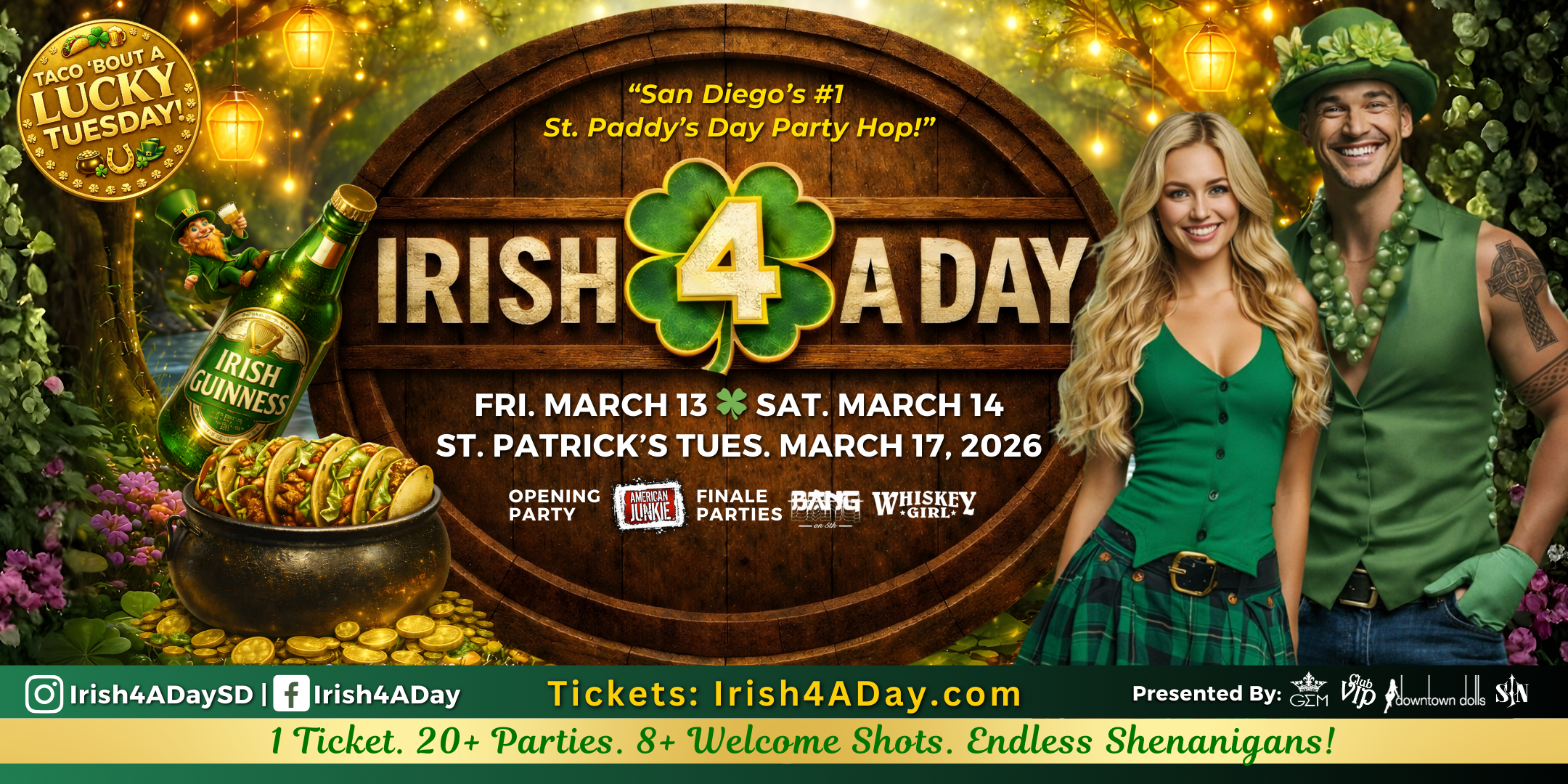 San Diego, FRIDAY SOLD OUT! Limited tickets still available for Sat 3/14 & Tues 3/17. Don't miss the jolliest St. Patrick's Day celebration in SoCal! The 2026 IRISH 4 A DAY is jampacked with multiple new venues, live entertainment, hosted shots and lucky deals, giving you even more savings, fun, fanfare, festivities and flavor (St Paddy's Day Meets Taco Tuesday on March 17, 2026)!