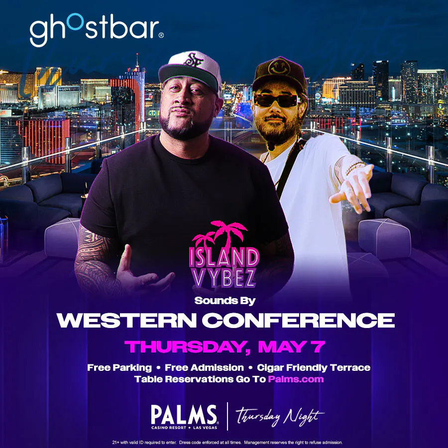 Ghostbar and the Palms Casino Resort presents ISLAND VYBEZ, featuring Western Conference DJ's. Big Body Cisco & Westafa return to the rooftop at Ghostbar. $10 Uncle Ed's Vodka Cocktails 9pm - 11pm. Bottle features on Uncle Ed's Vodka $150/bottle. Entertainment Subject To Change. Management Reserves All Rights.