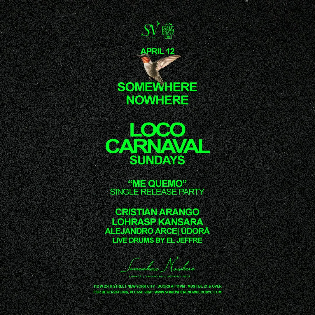 On Sunday, April 12th, Forest Döwn Under presents Loco Carnaval Sundays with music by Lohrasp Kansara, Cristian Arango, Alejo, ÜDORĀ and Live Drums by El Jeffre at Somewhere Nowhere NYC.