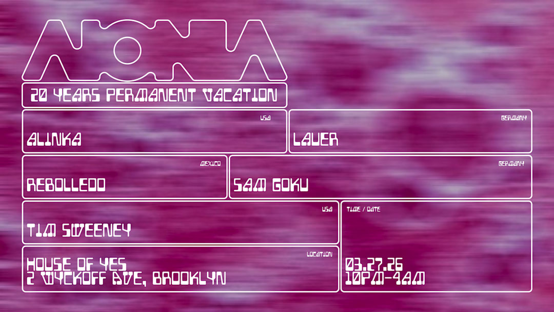 AIONIA [https://www.instagram.com/aionia.bk] returns to House of Yes for a full takeover, celebrating 20 years of the Permanent Vacation record label for its first ever NYC showcase Rebolledo, Alinka, Lauer + more.